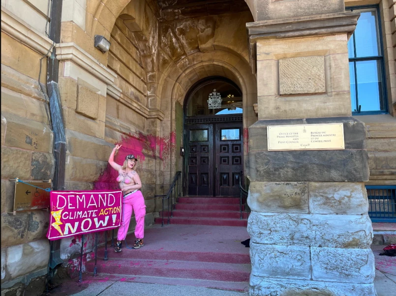 Na zdjęciach umieszczonych na Twitterze przez On-2-Ottawa widać kobietę ubraną tylko w różowe spodnie i ściany oblane różową farbą. Kobieta na zdjęciu trzyma różowy baner z napisem „Demand Climate Action Now!” (żądamy działań na rzecz klimatu teraz).