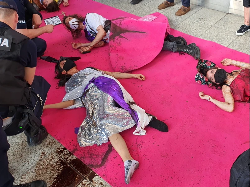 Przed Domami Towarowymi w centrum Warszawy aktywiści protestowali przeciwko "szybkiej modzie". Niektórzy z uczestników wydarzenia przykleili się do szyb budynku. Na miejscu obecna była policja. Zobaczcie, jak to wyglądało.