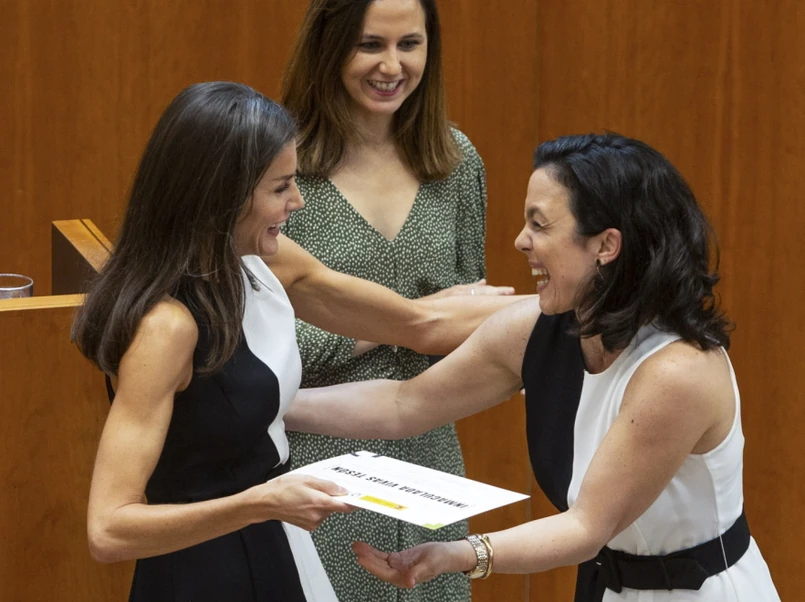 1/3 Królowa Letycja i profesor Vivas Teson w takich samych sukienkach na posiedzeniu Rady Królewskiej ds. Osób Niepełnosprawnych i ceremonii wręczenia nagród w Hiszpanii.