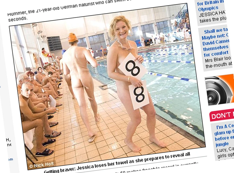 Jedna z brytyjskich dziennikarek, Jessica Hatcher, odważnie postanowiła wziąć udział w zawodach i przyjrzeć się, co się dzieje na największej międzynarodowej pływackiej gali golasów. Organizatorzy zgodzili się – oczywiście pod warunkiem, że reporterka wystąpi tak, jak inni uczestnicy: nago. Sama zawsze nienawidziła obnażać się publicznie. „Ale mój kraj mnie potrzebuje” – pomyślała.