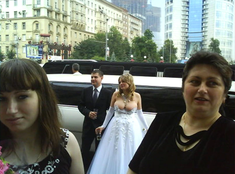 Kobieta, której personaliów nie znamy, wysiada z limuzyny, dumnie prezentując biust zakryty dwiema zaledwie strategicznie umieszczonymi kółkami. Suknia spotkała się z żywa reakcją internetowych komentatorów mody ślubnej. Jeden z blogerów umieścił suknię w kategorii "Pięciu najbardziej dziwkarskich sukni ślubnych". Pojawiały się komentarze, że sam wybór białej sukni jest mylący. Sporo jednak było typowych w kontekście zaślubin komentarzy w stylu: "Jaka piękna z nich para".
