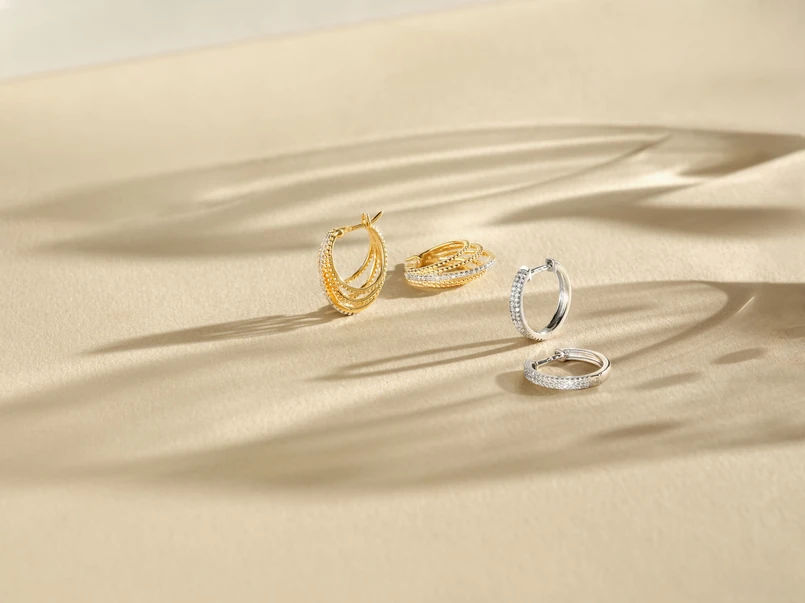 W kolekcjach pojawiają się geometryczne kształty, eleganckie kolczyki z perłami oraz delikatne nausznice układające się wzdłuż ucha. Srebro świetnie sprawdza się w stylu warstwowym – szczególnie jeśli masz kilka przekłuć i lubisz podkreślać indywidualny charakter stylizacji.