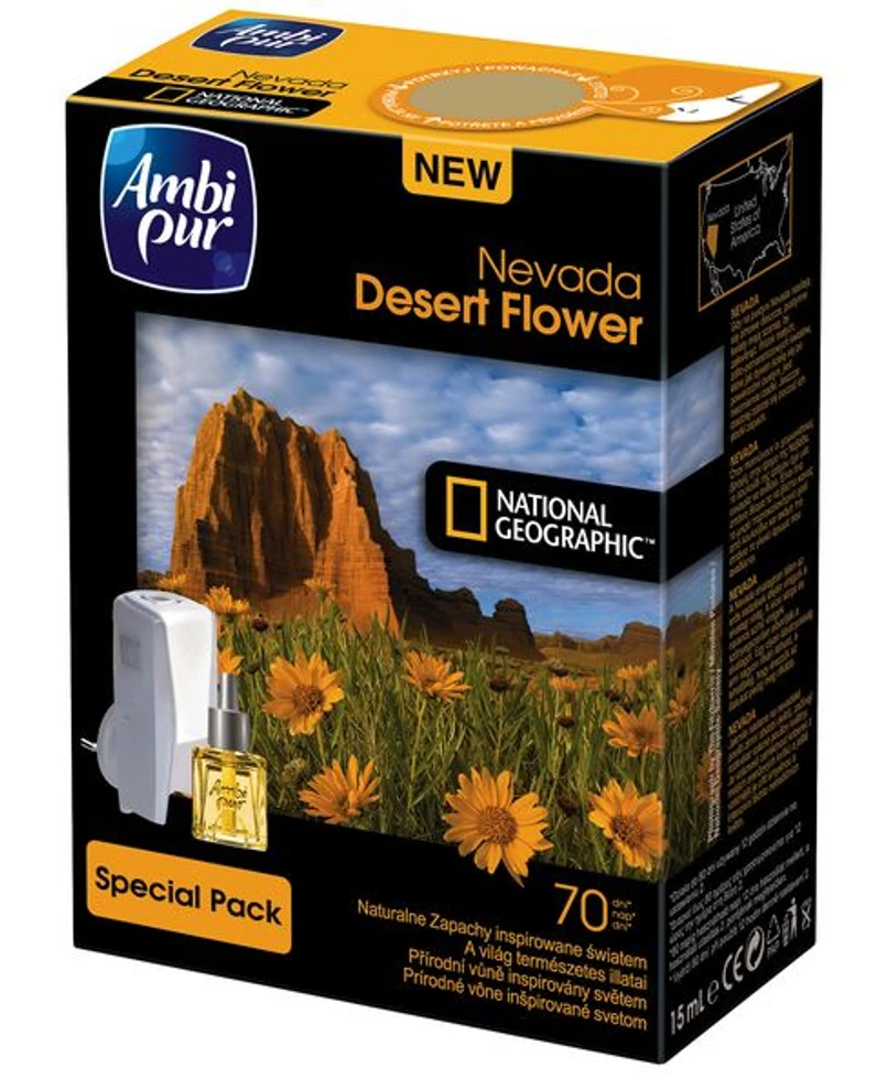 Nevada Desert Flower to delikatny, kwiatowy zapach zainspirowany cudem natury na pustyni Nevada, która raz do roku, w porze zimowych deszczów, pozwala zakwitnąć swoim kwiatom. Ten bardzo rzadki aromat, uchwycony przez Ambi Pur, łączy słodką nutę moreli i zielone zioła z korzennymi przyprawami.