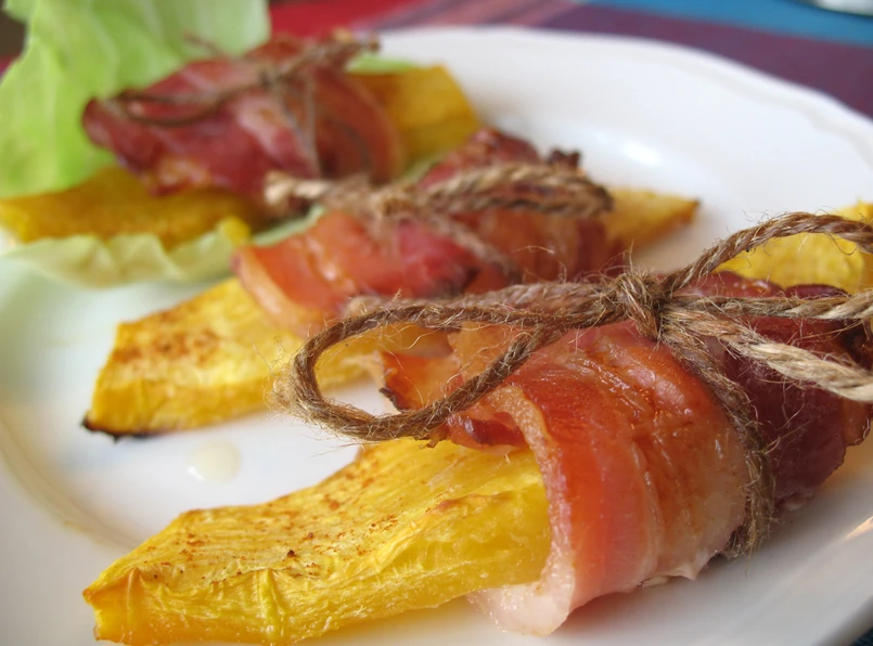 Ćwiartkę dyni oczyszczonej i obranej ze skórki pokrój w poprzek na plastry nie grubsze niż jeden centymetr. Każdy posyp brązowym cukrem i ostrym pieprzem cayenne. Każdy doprawiony kawałek dyni zawiń w plaster boczku i ułóż w żaroodpornym naczyniu lekko wysmarowanym oliwą. Aby boczek się nie rozwinął możesz nadziać owiniętą nim dynię na wykałaczkę lub obwiązać sznurkiem. Piecz ok. 45 min w piekarniku nagrzanym do 180 st. C. Podawaj gorące.