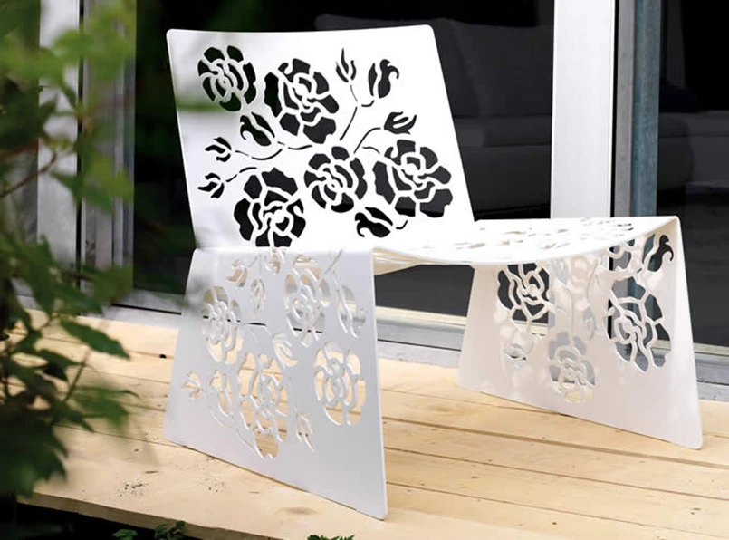 Ten interesujący mebel produkcji włoskiej jest wykonany z metalu wycinanego w różane wzory za pomocą lasera. Do kompletu można kupić także mały stolik i lampkę.