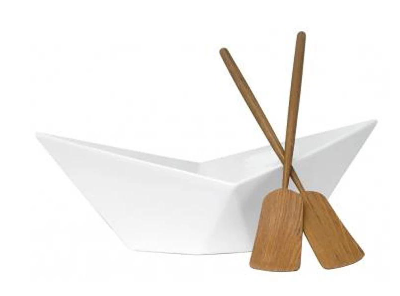 Jak sama nazwa wskazuje miska Paperboat wygląda jak papierowa łódeczka, wykonana w technice origami, a dołączone do niej łyżki - jak tradycyjne wiosła. Ale nic bardziej mylnego - naczynie jest maksymalnie stabilne, ciężkie, bo wykonane ze szkliwionej kamionki. Swoją lekką formę zawdzięcza zatem talentowi projektanta. Sztućce są odporne na wilgoć, bo wykonano je z drewna tekowego.