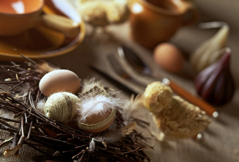 Oczywiście, żywe kolory nie sprzyjają kontemplacji, więc niektórzy z nas woleliby, by stół był bardziej stonowany. Nie ma problemu! Wystarczy lniany, zgrzebny obrus, beżowe czy szare talerze i kubki oraz jakaś dyskretna ozdoba: może skusisz się na nowoczesne rozrzucenie po stole ozdobionych jaj? Możesz także położyć gdzieniegdzie małe białe piórko, symbol wielkanocnego kurczątka. Do takiego spokojnego wystroju stołu idealne będą pęczkl bazi. Możesz wstawić je do wazonu, ale będą wyglądać naprawdę ciekawie także poukładane między zastawą. Będzie bliżej natury.