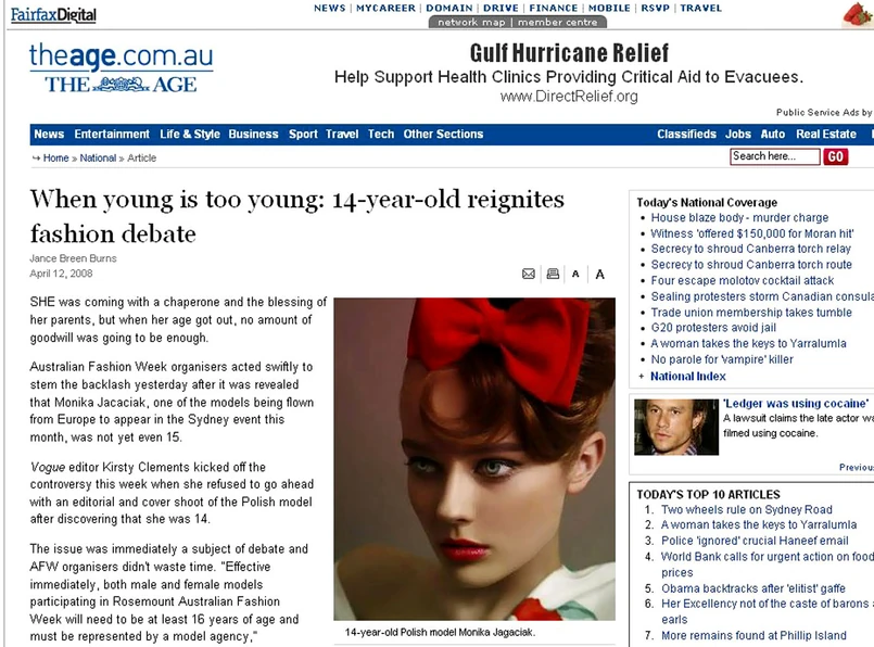 Zgodnie z obowiązującymi zasadami podczas pokazów w Londynie i Paryżu na wybieg nie są wpuszczane dziewczyny, które nie ukończyły jeszcze 16 lat. Wydawcy pism modowych nie pozwoli zapomnieć o tej regule również organizatorom australijskiego tygodnia mody. Zagrozili, że nie zamieszczą relacji z imprezy, jeśli na wybiegach zobaczą zbyt młode dziewczyny.