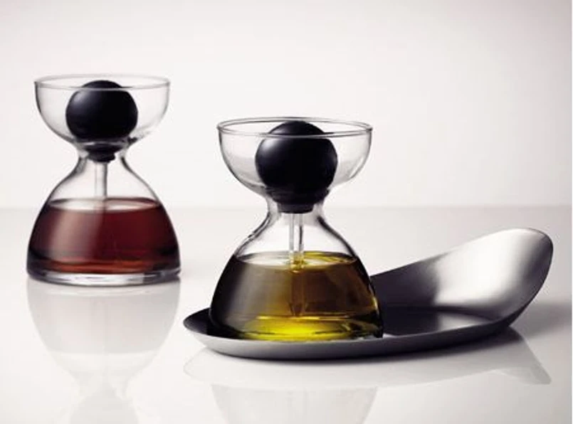 Komplet dwóch karafek na przyprawy został umieszczony na owalnej, stalowej podstawce. Specjalna pipetka pozwala odmierzyć minimalną ilość octu czy oliwy: wszak czasem jedna kropla czyni wielką różnicę. Zestaw doskonale prezntuje się na stole, a tacka zapobiega kapaniu. I ma jeszcze jeden atut: doskonale nadaje się na prezent, chociażby dla nowożeńców.