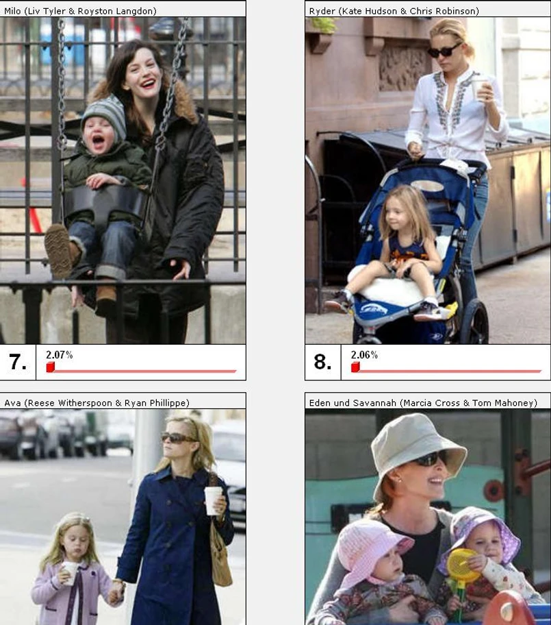 Na pozycji trzeciej znalazła się córeczka aktorki Salmy Hayek i milionera Gavina Rossdale'a, Valentina. Jak widać, ranking zdominowały dziewczynki. Dopiero na czwartym miejscu uplasował się syn pary muzyków Gwen Stefani i Gavina Rossdale, Kingston.