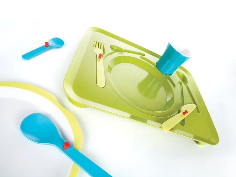 Produkt jest przeznaczony dla dzieci w wieku od 6 miesięcy do 3 lat, wykonany z melaminy i złożony z sześciu elementów: noża, widelca, łyżki, talerza i kubka ułożonych na tacy o antypoślizgowych nóżkach. Można go myć w zmywarce. Puzzle zapakowane są w atrakcyjne kolorowe pudełko.