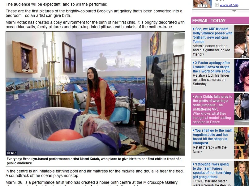 Marni Kotak i jej mąż Jason Bell (malarz) nie znają płci dziecka, ani nie wybrali jeszcze imion. Dziennie artystkę odwiedza w galerii około 20 osób. "Zwiedzający" mogą zostawić swoje dane kontaktowe, jeśli chcieliby jeszcze wrócić idealnie na czas porodu.
