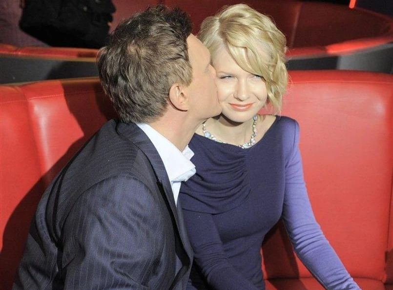Żona Cezarego Pazury miała na sobie idealnie dopasowaną niebieską sukienkę, korale i eleganckie czarne pantofle na obcasie.