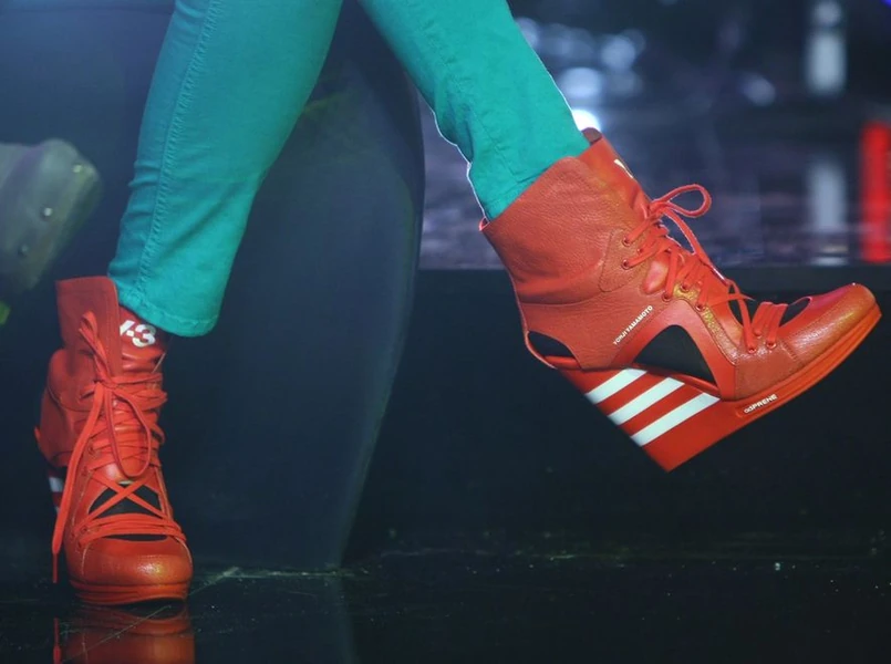Sablewska nie zrezygnowała z luźnego T-shirta i tak lubianych przez siebie obcisłych spodni. Jednak tym razem jej dżinsowe "rurki" miały kolor zielono-seledynowy. Całość kreacji uzupełniły oryginalne i dość dziwaczne buty w kontrastowym czerwonym kolorze. Obuwie Sablewskiej to fantazyjna mieszanka koturnów i butów sportowych, pochodząca z autorskiej linii Yohjim Yamamoto stworzonej dla marki Adidas.