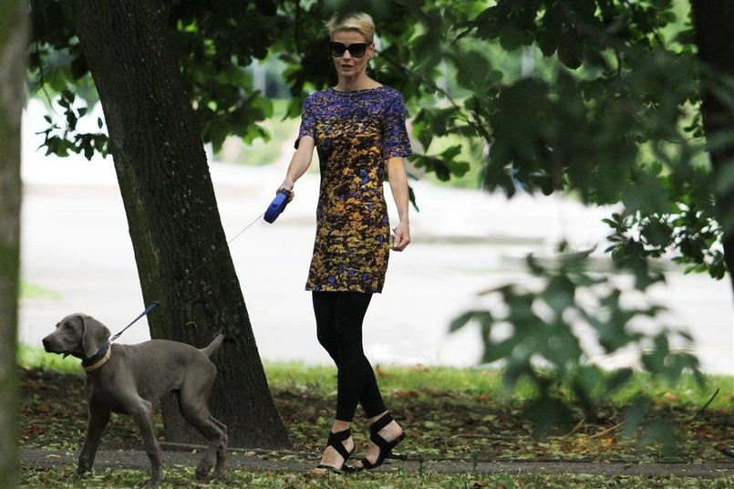 Serialowa aktorka z swoim pupilkiem udała się na długi spacer do parku. Piesek szalał, skakał, biegał a urocza aktorka tupała tuż za nim. I nie byłoby w tym nic dziwnego, gdyby nie fakt, iż Małgorzata Kożuchowska założyła bardzo nietypowe czarne buty na obcasach.