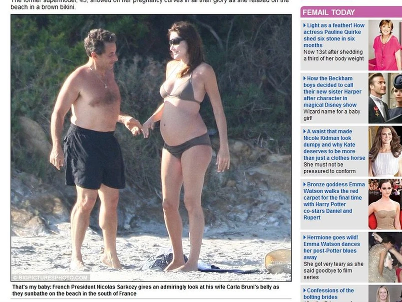 Zdjęcia prezydenckiej pary korzystającej z wakacyjnego wypoczynku opublikował brytyjski serwis dailymail.co.uk. Na zdjęciach widać Carlę Bruni w brązowym bikini, które odsłania w całej okazałości mocno już zaokrąglony brzuch Pierwszej Damy. Jej mąż dumnie zerka na brzuch żony, która jest obecnie w piątym miesiącu ciąży. 43-letnia była modelka nadal może się pochwalić szczupłym i gibkim ciałem i w ciąży prezentuje się znakomicie.