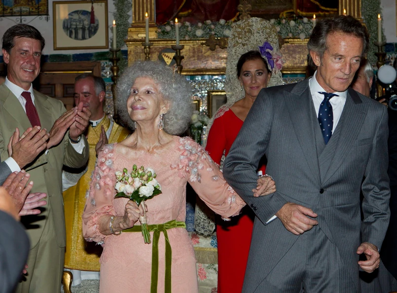Panna młoda - formalnie Maria del Rosario Cayetana Alfonsa Victoria Eugenia Francisca Fitz-James Stuart y de Silva - wystąpiła w bladoróżowej sukni z wąskim zielonym paskiem i w płaskich różowych pantofelkach. Ślub odbył się w należącym do księżnej zabytkowym pałacu Duenas w Sewilli. Ceremonię w pałacowej kaplicy odprawiło trzech księży. Zaproszono zaledwie 40 gości z najbliższej rodziny.