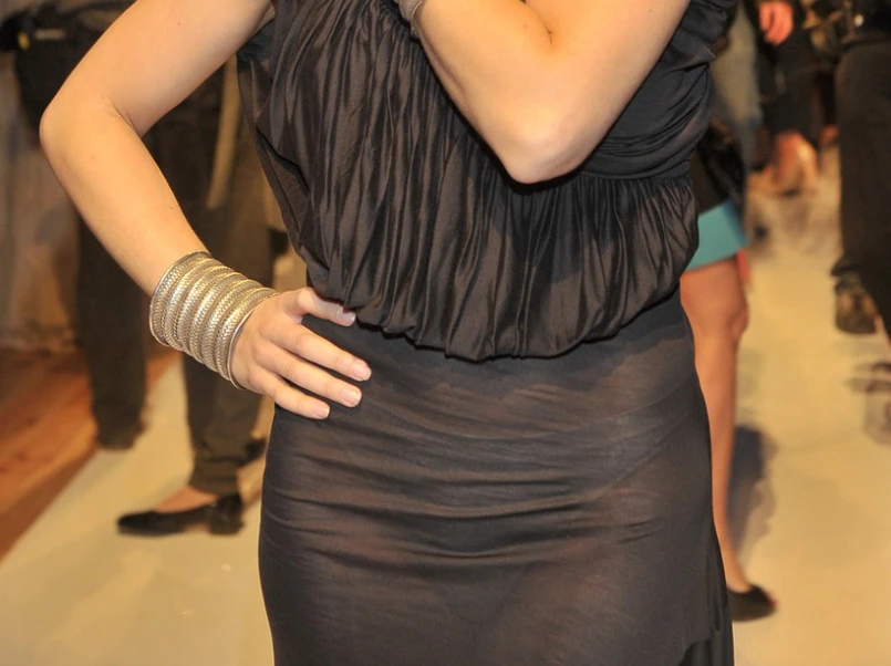 1 Obfite marszczenia w górnej części kreacji minimalizowały prześwit, ale nawet mimo tego sutki stylistki wyraźnie się odznaczały