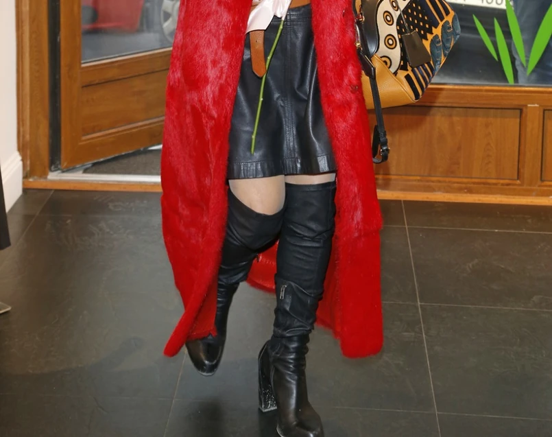 3 Skórzana sukienka, czerwony futrzany płaszcz, kozaki za kolano, biżuteryjna opaska na włosach, bardzo modne okulary przeciwsłoneczne i charakterystyczna torba - czy tego wszystkiego nie było odrobinę za dużo...?