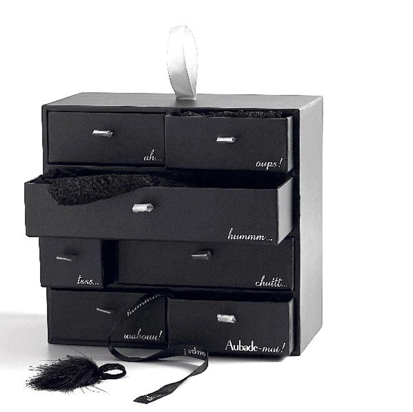 Wyobraź sobie gustowne, czarne pudełeczko z kilkoma szufladkami. Na każdej z szufladek jest napisane jakieś pikantne słówko. Otwierasz szufladki i wyciągasz z nich koronkowe cacuszka. Są czarne i na pierwszy rzut oka widać, że zaprojektowano je z myślą o łóżkowych igraszkach.