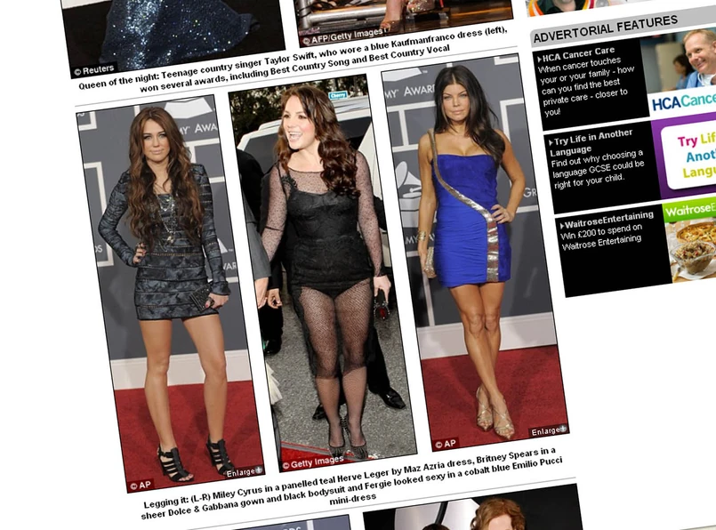 Księżniczka popu nie przeobraziła się niestety w królową. Nadal nie daje sobie także rady z doborem kreacji. Na Grammy postanowiła być seksowna, ale jej dziwaczna kreacja plasuje się poniżej wszelkich oczekiwań. No i odkrywa to, co Brit powinna jednak zakrywać: masywne uda. Dla porównania: na zdjęciu możesz także zobaczyć dwie gwiazdy, które wiedzą, jak się zaprezentować w starciu z setkami fleszy aparatów fotograficznych...