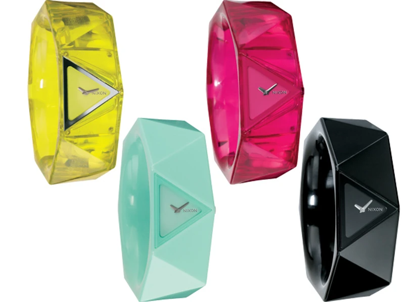 Zegarki są plastikowe i wyglądają jak bransoletki, które zgodnie z trendami powinny być duże, widoczne i bardzo kolorowe. Tarcze mają trójkątne, a na blatach nie ma cyferek, żeby było jak najbardziej nowocześnie.