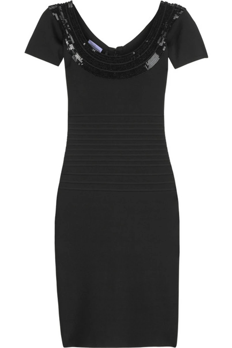 Herve Ledger proponuje sukienkę nieco krótszą, ze skromnymi rękawkami. Dekolt ozdabia cekinowa aplikacja - szeroki, błyszczący pas. To zamyka nieco drogę niektórym dodatkom, ale jednocześnie zwalnia cię z obowiązku dobierania naszyjnika - wszystko ma swoje plusy. Cena: ok. 1800 euro.