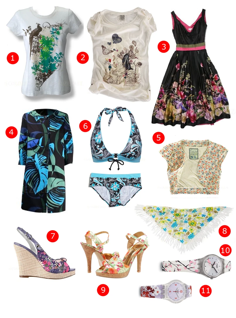 1. T-shirt, Orsay, 49,90 zł; 2. T-shirt, Pull & Bear, 59 zł; 3. Sukienka Solar, 249 zł; 4. Płaszcz, Jacqueline Riu, 349,90 zł; 5. Bolerko, Pull & Bear, 69,90 zł; 6. Bikini, KappAhl, góra: 59,90 zł, dół: 39,90; 7. Sandały, CCC, 89,99 zł; 8. Apaszka, S.Olivier, 75, 90 zł; 9. Sandały, Mome Brillier, 179 zł, www.butyk.pl; 10. Zegarek, Swatch, 180 zł; 11. Zegarek, Swatch, 190 zł.