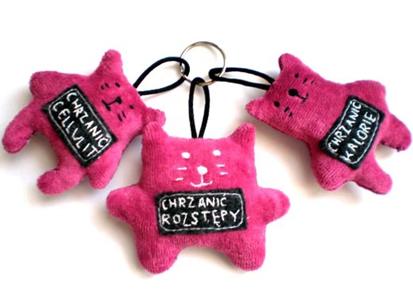 Każdy z elementów - różowych kotków - jest opatrzony buntowniczym hasłem: "chrzanić cellulit", "chrzanić rozstępy", "chrzanić kalorie". Chrzańmy je więc, z breloczkiem czy bez niego.