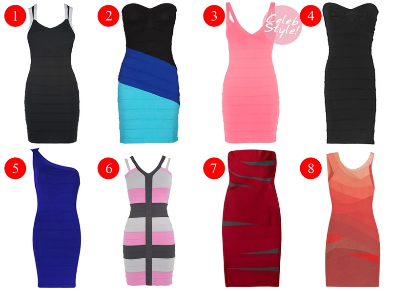 1. Czarno-biała, 70 funtów; 2. Fioletowa, 70 funtów; 3. Niebiesko-granatowo-czarna, 65 funtów; 4. Czarna bez ramiączek, 65 funtów; 5. Szafirowa asymetryczna, 30 funtów; 6. Różowo-szara, 30 funtów; 7. Herve Leger, 1590 euro; 8. Herve Leger, 1775 euro.