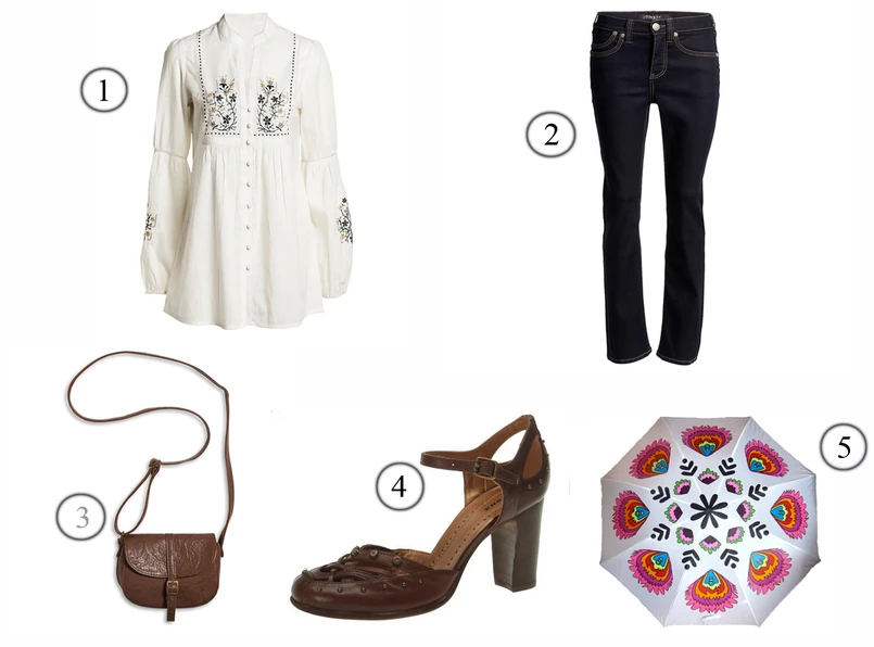 1. Bluzka haftowana, 139 zł; 2. Dżinsy, 199 zł; 3. Torebka, 59 zł; 4. Buty, www.butyk.pl, 165 zł; 5. Parasolka, www.ludowomI.pl, 85 zł.