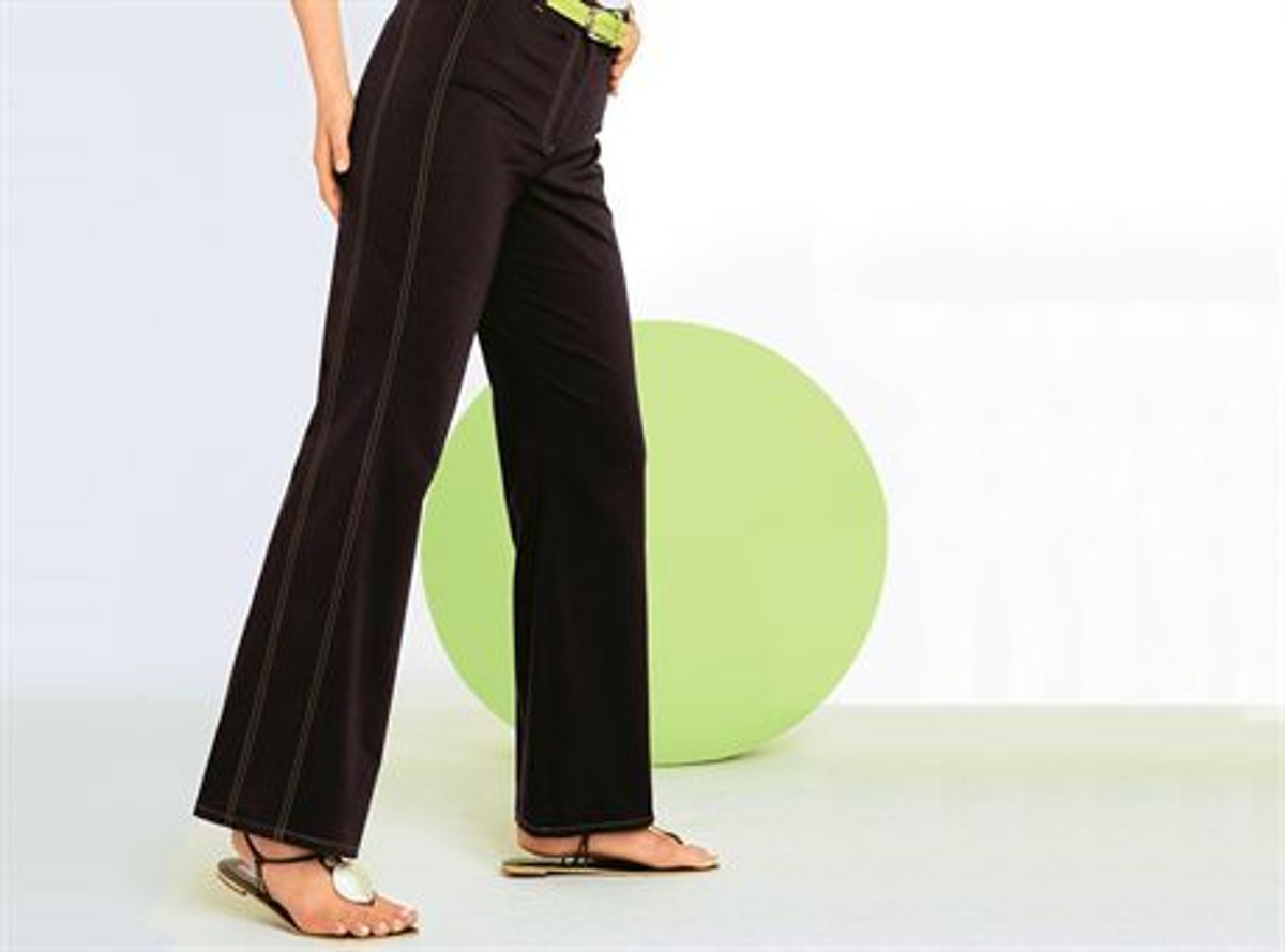 Luźne nogawki pozwalają ukryć uda. Najlepsze są spodnie w wysmuklające pionowe paski, w kolorze ciemniejszym niż bluzka czy żakiet.