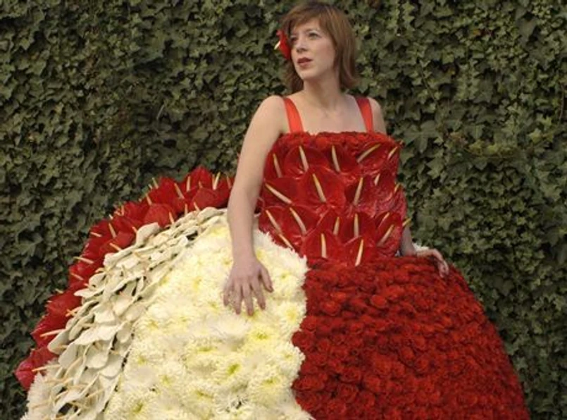 Spódnica z gipsówki, gorset z róż to pomysł Luci Sacchi. Jesteś wstydliwa? Zakryj się różami, ułożonymi w geometryczne wzory od Partner & Flower Design.