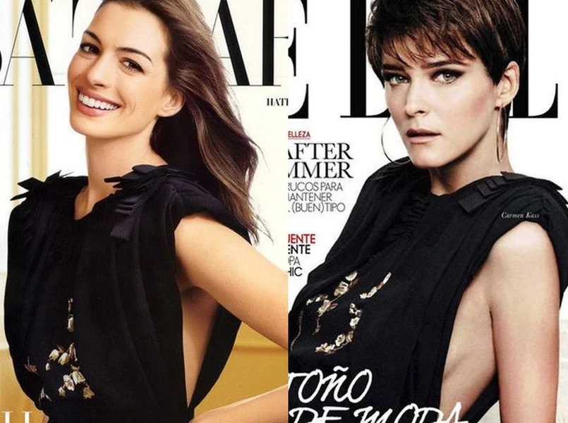 W czarnej kreacji Miu Miu na okładce "Harper’s Bazaar" pojawiła się Anne Hathaway. Piękna gwiazda filmu „Diabeł ubiera się u Prady” pozowała w subtelnej stylizacji: naturalnym makijażu i rozpuszczonych włosach. Zupełnie inaczej tę samą sukienkę na okładce magazynu Elle zaprezentowała Carmen Kaas. Słynna modelka pokazała się w stylizacji „z pazurem” – w wyrazistym makijażu i z utrzymaną w podobnym charakterze biżuterią.
