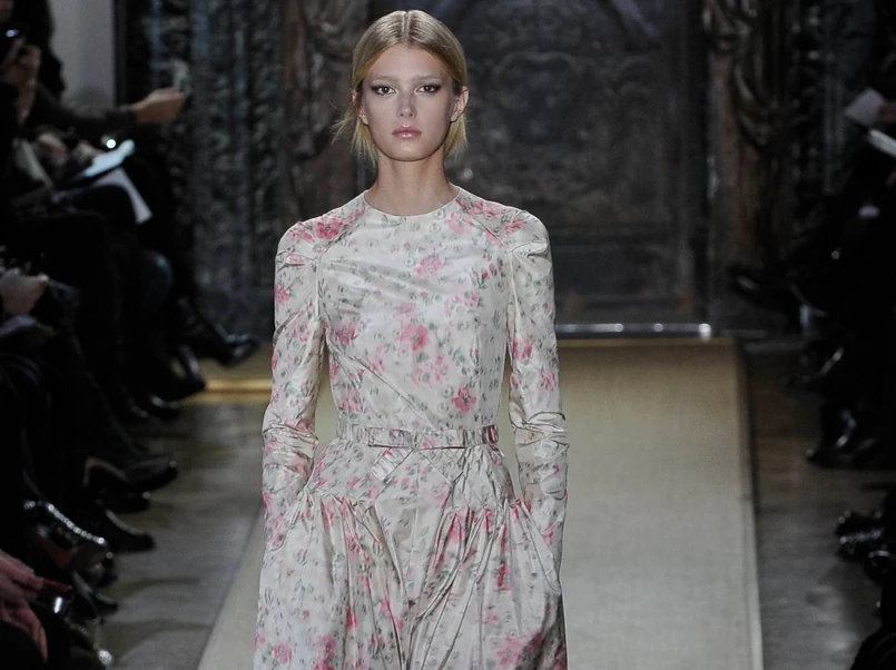 Uwagę zwracały zwłaszcza delikatne i eleganckie materiały jak cienka, przeźroczysta koronka z Chantilly w kolorze mleka i śmietanki, rozmyte nadruki kwiatów, warstwy tiulu czy Toile de Jouy - dekoracyjne tkaniny wytwarzane od 1760 roku w manufakturze w Jouy niedaleko Wersalu. Zwłaszcza tych ostatnich dawno nie oglądaliśmy na ubraniach dla dorosłych, za to ze względu na swój sielankowy charakter często zdobią stroje dla najmłodszych. Zresztą u Valentino sielankowe były nawet buty. Zamiast seksownych szpilek - uzupełnieniem kolekcji haute couture były - koronkowe, miękkie pantofle i czółenka.