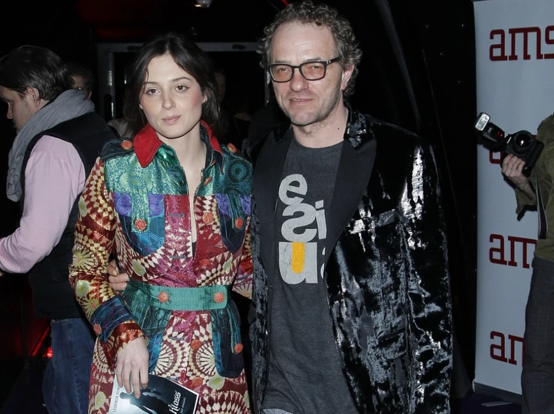 Na tę okazję partnerka Piotra Najsztuba założyła bardzo kolorowy i rzucający się w oczy płaszcz, oryginalnie łączący różne tkaniny i wzory.