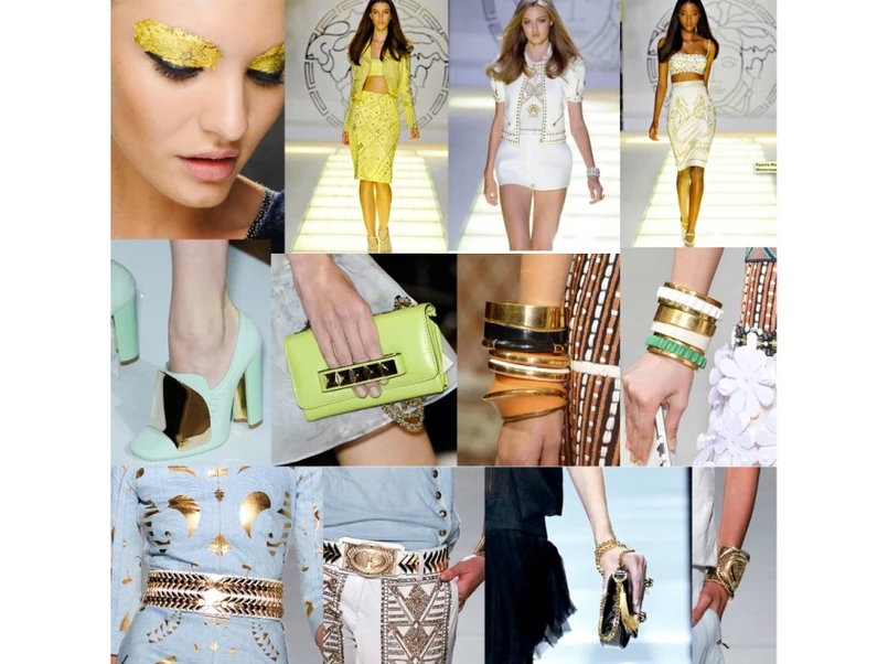 Złote dodatki pojawiły się na wybiegach u Balmain, Gucci czy Marni. Jednak złoto w tym sezonie to nie tylko akcesoria. Bogate zdobienia w tym królewskim kolorze były widoczne w całej kolekcji Versace, a także butach Yves Saint Laurent czy torebkach Valentino. Odważnym, złotym makijażem oczu zaskoczyła z kolei marka Givenchy.