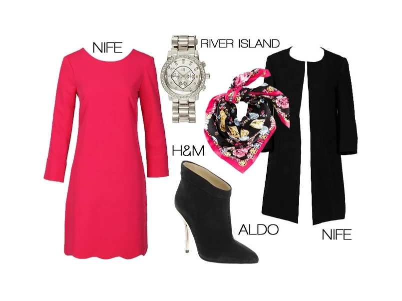 W wersji casualowej fuksja doskonale prezentuje się z łagodnymi beżami. Kolor sukienki został złagodzony delikatnym odcieniem płaszcza oraz dodatków. Charakteru całości dodaje zdobny i masywny naszyjnik.
