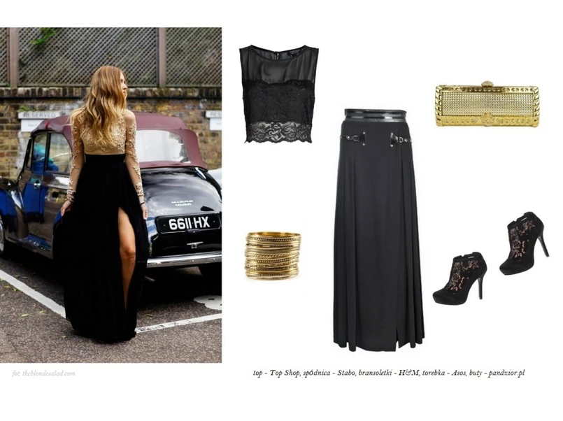 Styl Chiary Ferragni, prowadzącej blog theblondesalad.com to eklektyzm w każdym calu. Blogerka umiejętnie łączy trendy, przez co efekt jest piorunujący. Do stworzenia pierwszej stylizacji zainspirowała nas długa suknia z górą ozdobioną mięsistą koronką, którą Chiara zaprezentowała w jednym ze swoich wpisów. Podobny zestaw można stworzyć łącząc zwiewną, maxi spódnicę z koronkowym topem. Dodając do niego złote dodatki podkreślimy elegancki charakter kreacji.