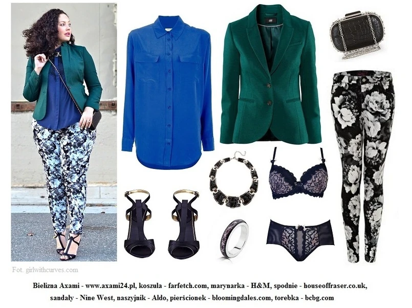 Tanesha Awasthi, autorka bloga girlwithcurves.com, słynie z doskonałego wyczucia stylu. Żadne trendy nie są jej straszne, nawet pogrubiające nogi spodnie ozdobione kwiatowymi printami. Umiejętnie zestawione z modną w tym sezonie kobaltową koszulą, zielonym żakietem oraz sandałkami stworzyły godny uwagi look, którym warto się zainspirować! Idealnym uzupełnieniem tej stylizacji będzie oczywiście ozdobiony zmysłową koronką komplet marki Axami.