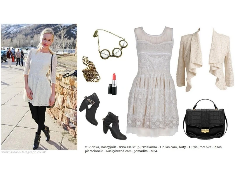 Postaw na kontrast. Jeśli lubisz wyróżniać się z tłumu tak jak Kate Bosworth – rockowe połączenie bieli z czernią będzie idealnym rozwiązaniem! Oryginalną sukienkę o niezwykle dziewczęcym kroju przełam niebanalnymi dodatkami. Ciężkie botki w militarnym stylu i naszyjnik w kolorze starego złota z Fu-Ku.pl perfekcyjnie dopełnią całą stylizację. Przysłowiową „kropką nad i” będzie klasyczna torebka i oczywiście pomadka w wiosennym, pomarańczowym kolorze!
