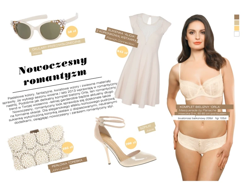 Świetnie skrojona sukienka zestawiona z odważnymi dodatkami pozwoli uzyskać Ci efekt glamour. Pod takie kreacje najlepiej wpisuje się subtelna i wyrafinowana bielizna w pastelowych barwach. Jeżeli nie chcesz, aby była widoczna, jasny biustonosz idealnie stopi się z białymi lub przezroczystymi elementami garderoby. Stylizację możesz uzupełnić jasnymi szpilkami i małą torebką. Nowoczesny romantyczny look sprawdza się doskonale na formalnych okazjach, ale w tym zestawie śmiało możesz wyjść także do pracy.