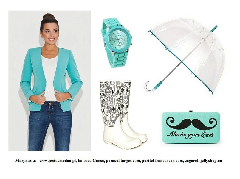 Turkus to jeden z najgorętszych kolorów tego sezonu, a to oznacza, że skąpana w nim marynarka ze sklepu Jestesmodna.pl to obowiązkowy must have w Twojej szafie! Po zestawieniu jej z białym topem i jeansami powstanie bezpieczna i stonowana stylizacja, której charakteru bez wątpienia dodadzą białe kalosze ozdobione czarnym printem, ogromny, przezroczysty parasol z turkusowymi akcentami, portfel ze słynnymi wąsikami, a także designerski zegarek!