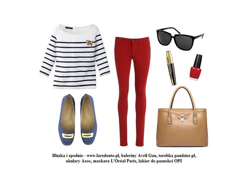 Wąskie, czerwone spodnie są świetną podstawą iście paryskiego looku! Dobierz do nich prosty, biały top w paski ze sklepu internetowego Laredoute.pl i wygodne, niebieskie baleriny, a uzyskasz prosty i wygodny strój na spacer. Pojemna torba pomieści wszystkie niezbędne drobiazgi, a klasyczne okulary przeciwsłoneczne i czerwony lakier do paznokci idealnie uzupełnią tę codzienną stylizację!