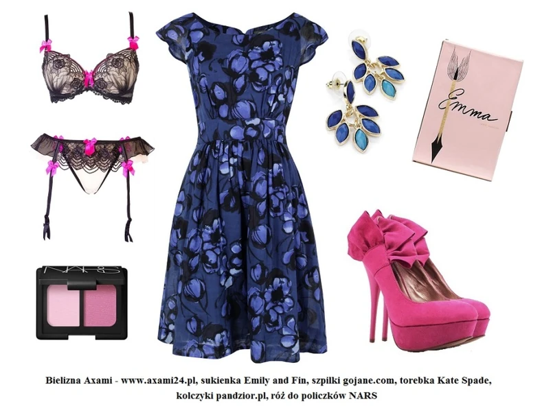 Wzorzysta, skąpana w różnych odcieniach błękitu sukienka będzie świetnie wyglądać z kontrastującymi z nią różowymi szpilkami ozdobionymi kokardkami. Klimat retro dopełnią kopertówka w kształcie książki i to nie byle jakiej, bo wzorowanej na słynnej powieści Jane Austen, a także kolczyki. Nic dodać, nic ująć. Więcej dodatków nie trzeba. Pora więc dobrać bieliznę. Nasz typ? Zmysłowy komplet Axami, składający się z biustonosza, string, a także pasa do pończoch. Połączenie lekkiego jak mgła szyfonu z przejrzystą koronką, wykończone tasiemką w odcieniu różu, robi wrażenie, prawda?