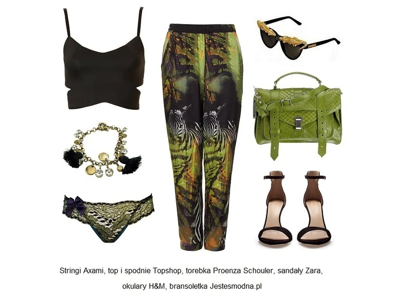 Kochasz zieleń? To świetnie! Bo pierwsza stylizacja jest właśnie dla Ciebie! Oryginalne, przewiewne spodnie przykuwają wzrok tropikalną mieszanką deseni, a ciekawie wycięty top doskonale z nimi współgra. Po uzupełnieniu tej stylizacji o skąpane w nasyconej zieleni, niezwykle kobiece stringi marki Axami, które zapewnią niebywały komfort podczas przemierzania miejskiej dżungli, okulary ze złotymi krokodylami na oprawkach, bransoletkę z frędzlami i zieloną, pojemną torbę ze skóry powstanie niesamowicie drapieżny look w sam raz na lato w mieście!