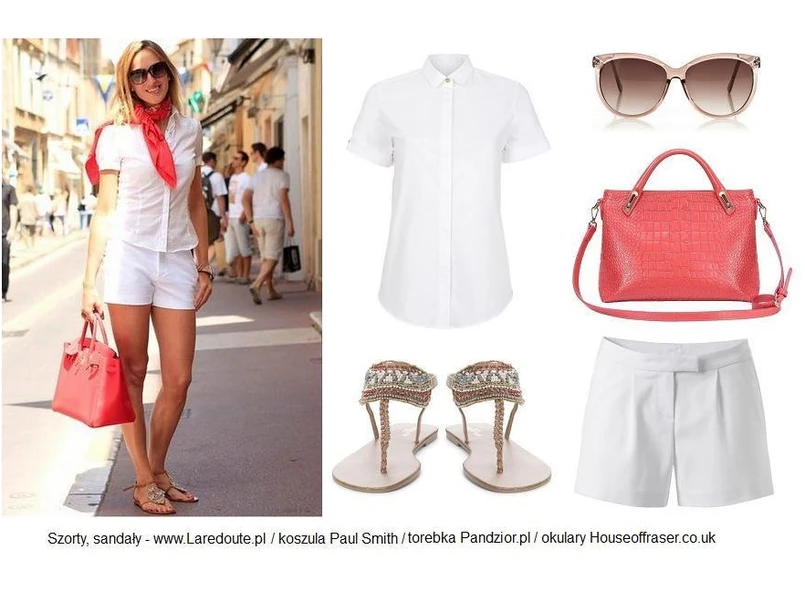 Wychodząc do pracy, postaw przede wszystkim na klasykę. Do lekkiej koszuli z krótkim rękawkiem dopasuj eleganckie luźne szorty ze sklepu Laredoute.pl. Biały total look uzupełnij mocnymi dodatkami jak koralowa skórzana torba, ozdobne, plecione sandałki z koralikami oraz duże okulary przeciwsłoneczne.