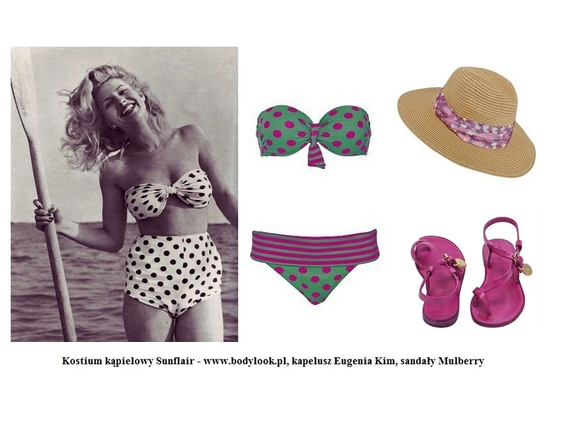 Chili Williams (główne zdjęcie) znana była jako "dziewczyna w groszkach", ponieważ na wielu zdjęciach pozowała w ubraniach właśnie w tym wzorze. Jeśli podobnie jak Chili uwielbiasz ten deseń, zdecyduj się na podkreślające kobiece walory bikini w fioletowe grochy. Do kostiumu dobierz elegancki, pleciony kapelusz oraz wygodne i lekkie sandały w podobnym odcieniu, które doskonale uzupełnią ten iście wakacyjny look.
