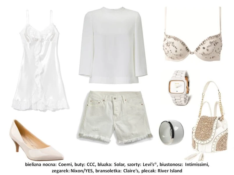 Szlachetna, klasyczna biel (na głównym zdjęciu) przywodzi na myśl świeżość letniego poranka, pianę morskich fal i chłodną bryzę. Szorty z postrzępionymi nogawkami i prosta, ale efektowna bluzka zostały uzupełnione jednokolorowymi akcesoriami, które zyskały na oryginalności dzięki ciekawym ozdobom. Błyszczące kamienie, złote wykończenia, łańcuszki i diamenciki sprawiają, że minimalistyczny zestaw może z powodzeniem sprawdzić się wieczorową porą i pomóc Ci zawojować imprezowy parkiet.