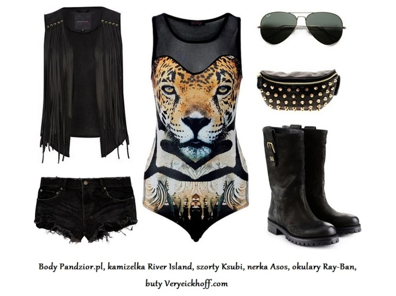 Drzemie w Tobie dzikie zwierzę? Pokaż zatem pazurki i do pierwszej stylizacji wybierz body z motywem geparda (główne zdjęcie). Dobierz do niego czarne, postrzępione szorty oraz ulubione biker boots. Skórzana kamizelka z frędzlami i nerka z ćwiekami dodadzą stylizacji drapieżnego charakteru, a okulary przeciwsłoneczne stylowo uzupełnią ten modny zestaw.